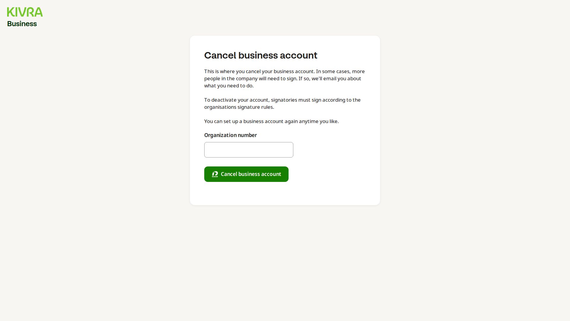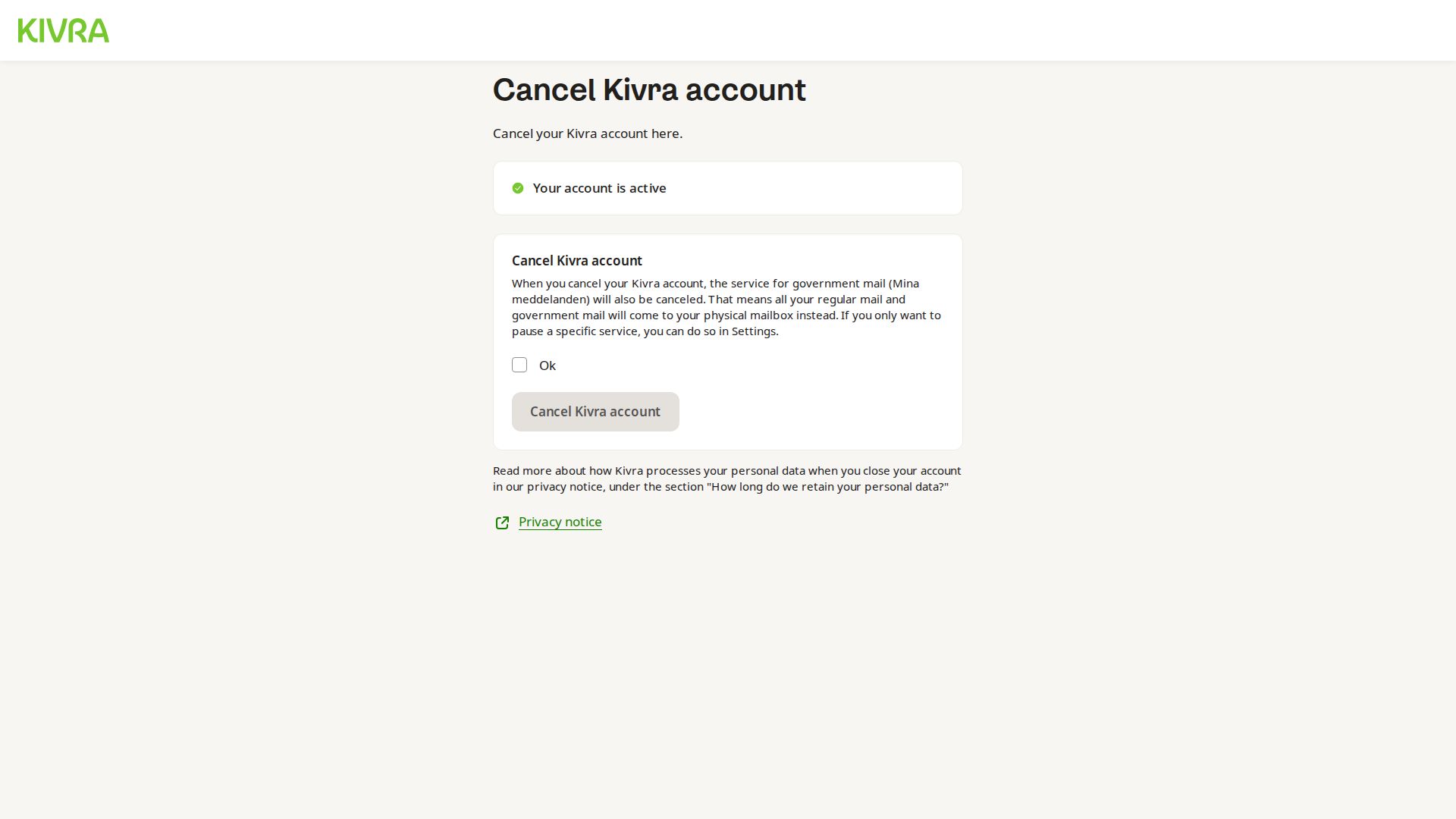 <div><p class="css-6az692">Kivra</p><p color="$text-secondary" class="css-1r4a5qc">Cancel your account</p></div>