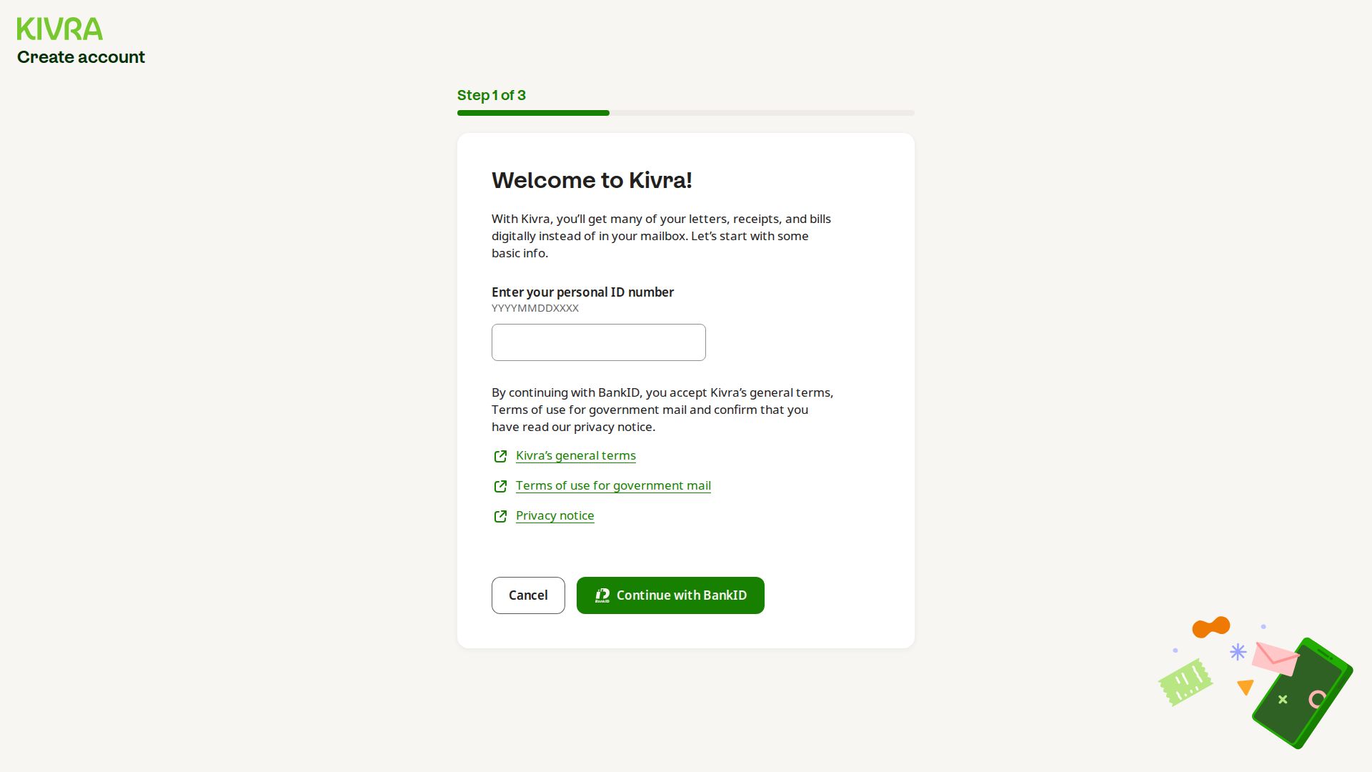 <p class="css-11s6vt6 css-xm9hwu">By continuing with BankID, you accept Kivra’s general terms, Terms of use for government mail and confirm that you have read our privacy notice.</p>
