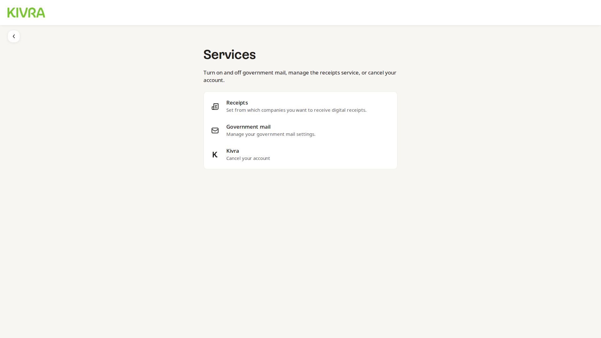 <p color="$text-primary" class="css-xm9hwu">Turn on and off government mail, manage the receipts service, or cancel your account.</p>